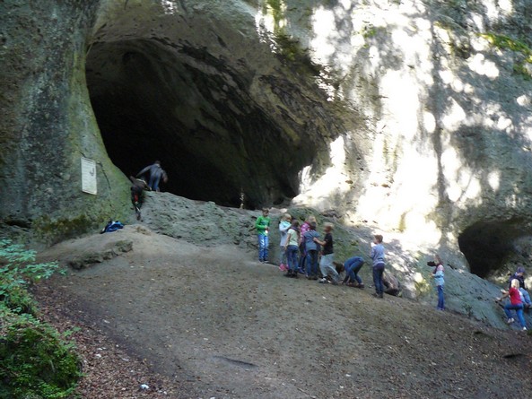Eine Woche später besuchten wir das Hasenloch. Nach einem Abstecher auf die „Himmelsleiter“ kamen wir dort an. Mit Taschenlampen ging es an die Erkundung der Höhle. Funde haben gezeigt, dass dies ein Unterschlupf und Schutz vor schlechtem Wetter für die Jäger der Steinzeit war. Vielleicht wurde dort auch so manches Mammut verzehrt.