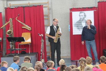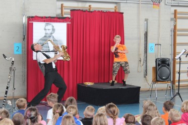 Noch bevor Jan Burdinski, Intendant des Fränkischen Theatersommers, und Musiker Johannes Neuner am Abend ihr Stück im Bürgerhaus Pottenstein auf die Bühne brachten, erlebte das "Adolphe Sax Theater" am Vormittag des 11. Juli in seiner Kinderversion die Premiere an der Graf-Botho-Schule Pottenstein. In einer bunten Mischung aus Musik, Geschichte und Mitmachtheater brachten die Beiden den Kindern das bewegte Leben des Adolphe Sax, dem Erfinder der Saxophone, näher.