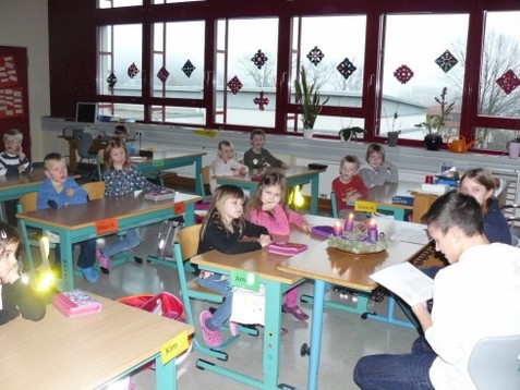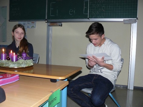Zahlreiche Neuntklässler lasen in der ersten Klasse die Adventskalender-Geschichte von Jan, Lisa und der Oma aus dem Hafergässchen vor. Eine der eifrigsten Vorleserinnen war das Pottensteiner Christkind. Aber auch zahlreiche Jungs „wagten“ sich an das Vorlesen.