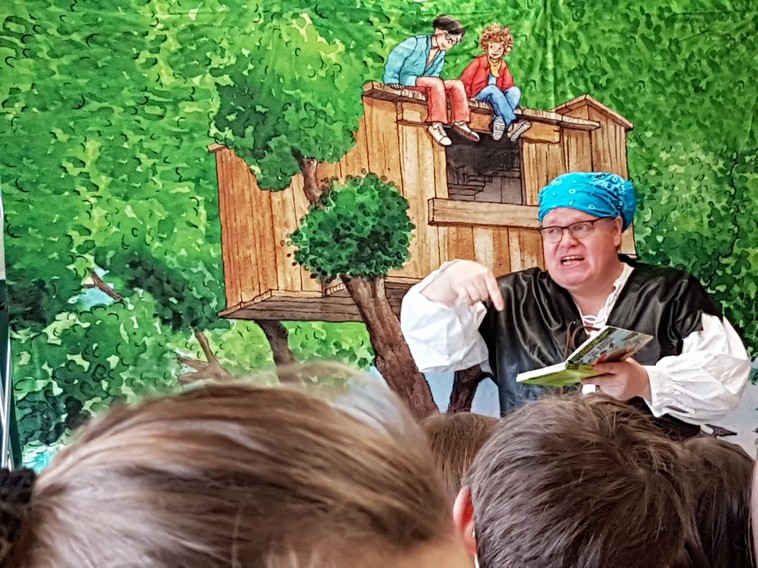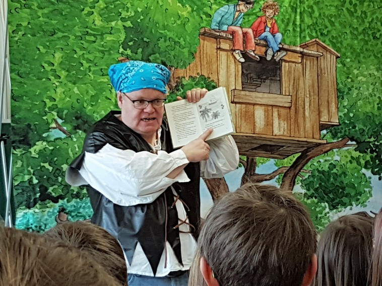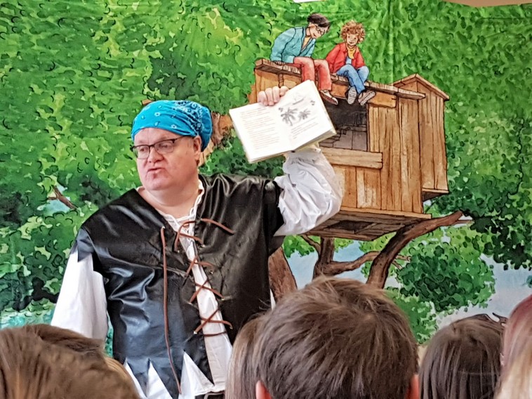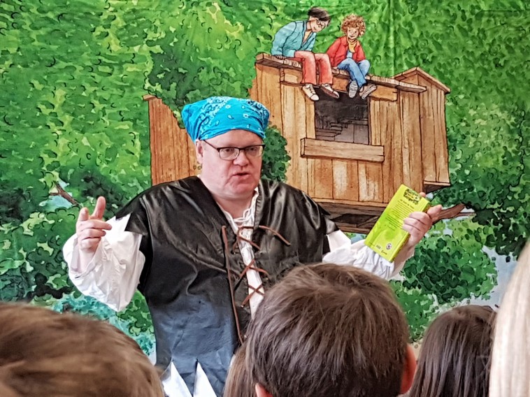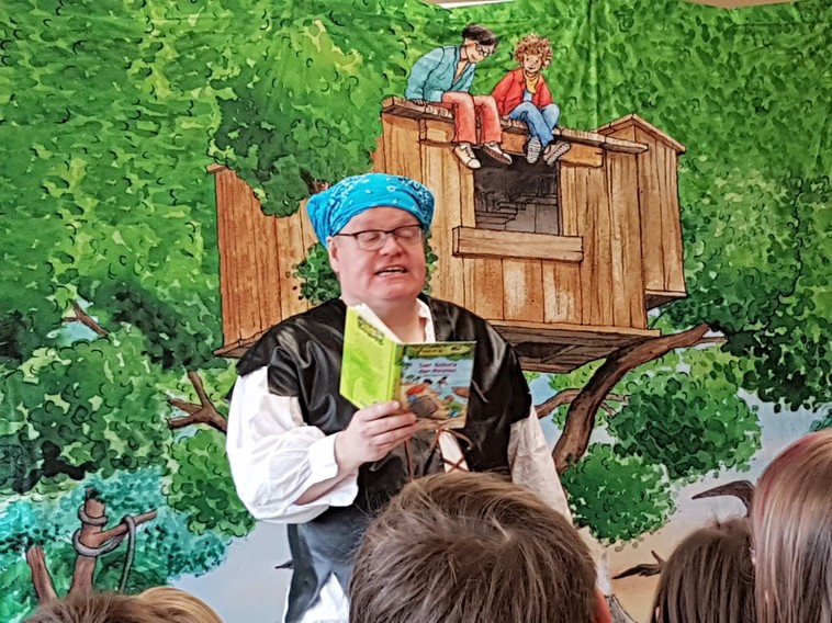 Bei einer Lesung mit Schauspieler Stephan Bach erlebten unsere Schülerinnen und Schüler der Klassen 2a/b, 3a/b und 4a ein Kinderbuch auf eine ganz besondere Art. Stephan Bach, der mit dem Leseevent zur Buchreihe Das magische Baumhaus unterwegs ist, entführte die Kinder mit seinem Vortrag in verzauberte Welten. Mit den Hauptpersonen Anne und Philipp ging es auf die spannende Reise. Dabei war nicht nur Zuhören angesagt, sondern aktives Mitmachen. Mitreißend, fesselnd und aufregend setzte Bach die Literaturvorlage um. So fiel es den Kindern nicht schwer, ganz in die Geschichte einzutauchen und das Abenteuer mitzuerleben. Bach bezog sie immer wieder mit ein, animierte sie, Geräusche zu imitieren, Gefühle mit ihrem Körper auszudrücken oder die Handlung in Bewegungen umzusetzen. Alle hatten sichtlich großen Spaß dabei. Und viele Kinder waren sich sicher: Das nächste Buch musste ein Band vom Magischen Baumhaus sein!