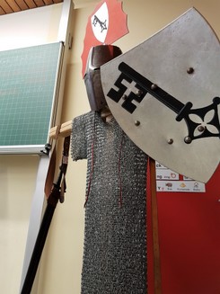 Zur Illustration hatte Thomas Bernard ein Kettenhemd, Schwert, Helm und Schild aus dem Fränkische-Schweiz-Museum mitgebracht.