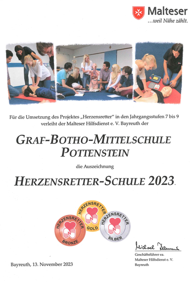 Im laufenden Schuljahr absolvierten die ersten Schülerinnen und Schüler der GBS Pottenstein den Gold-Kurs der Ausbildung zum Herzensretter – damit ist nun die Schule zugleich auch offizielle „Herzensretter-Schule“. Die Urkunde erhielt Schulleiter Marco Speckner von Malteser-Geschäftsführer (Bayreuth) Michael Danner direkt nach dem Kurs.