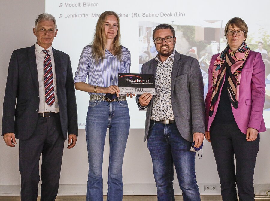 Aus den Händen von Prof. Dr. Wolfgang Pfeiffer und Ministerialrätin Birgit Huber durften Bläserklassenleiterin Sabine Deak und Schulleiter Marco Speckner im Rahmen einer feierlichen Zertifizierungsveranstaltung an der Friedrich-Alexander-Universität in Nürnberg die begehrte Auszeichnung „klasse.im.puls“ entgegennehmen.