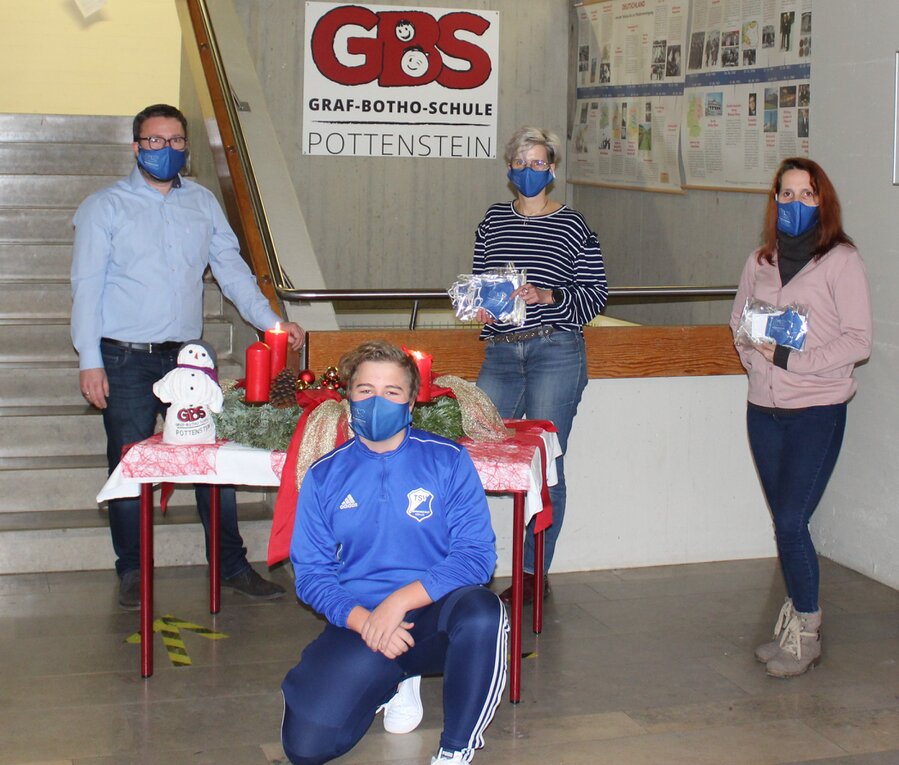 Mit einer besonderen Überraschung standen am 15.12., dem letzten Tag mit Präsenzunterricht an bayerischen Schulen, zwei Vertreterinnen des Elternbeirates der Graf-Botho-Schule Pottenstein vor der Tür. Im Gepäck hatten sie 260 Masken mit GBS-Logo für alle Schülerinnen und Schüler der Schule.