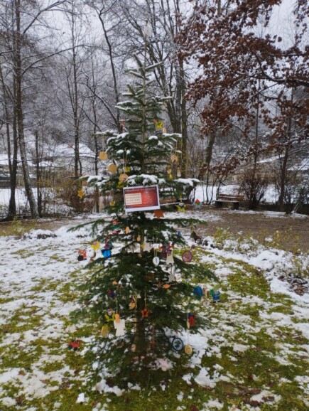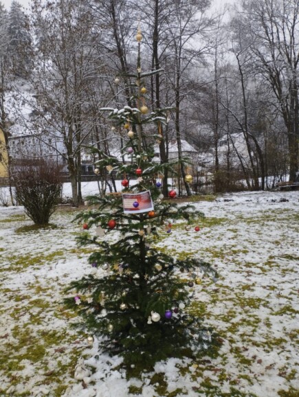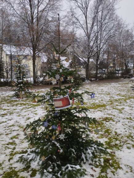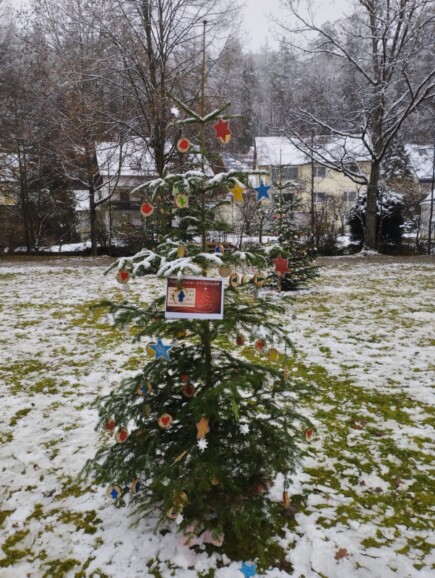 Bereits am Tag vorher hatten sich alle Klassen der Schule an der Weihnachtsbaum-Aktion im Kurpark beteiligt. Insgesamt vier Christbäume schmückten die 270 Schülerinnen und Schüler unserer Schule mit selbsthergestelltem Weihnachtsschmuck. Über den ganzen Vormittag verteilt fanden sich die Klassen im Kurpark ein, um „ihren“ Baum festlich zu dekorieren. Untermalt wurde die Veranstaltung von weihnachtlichen Klängen des Schulorchesters, das die ohnehin winterliche Stimmung noch steigerte.
