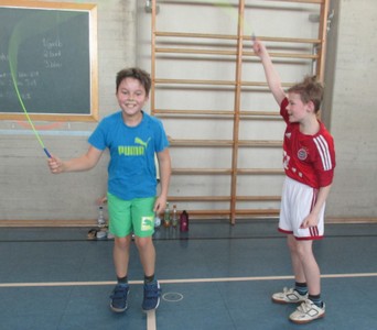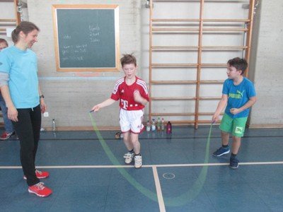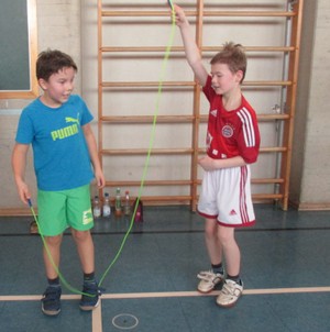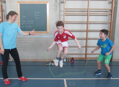 Begeistert nahmen die Kinder am gemeinsamen Training teil. Innerhalb von zwei Stunden wurden verschiedenste Sprungvarianten eingeübt, die anschließend in einer Vorführung gezeigt wurden. Ob Jogging-Stepp, der Side-Swing oder der Partner-Sprung – nach der kurzen Trainingszeit konnten die Kinder bereits erste Erfolgserlebnisse erzielen. Schnell zeigte sich, dass das Seilspringen ein hervorragendes Herz-Kreislauf-Training ist. In einer kurzen Präsentation vor interessierten Eltern und Schülern der übrigen Klassen zeigten die Sportler anschließend ihr Können.