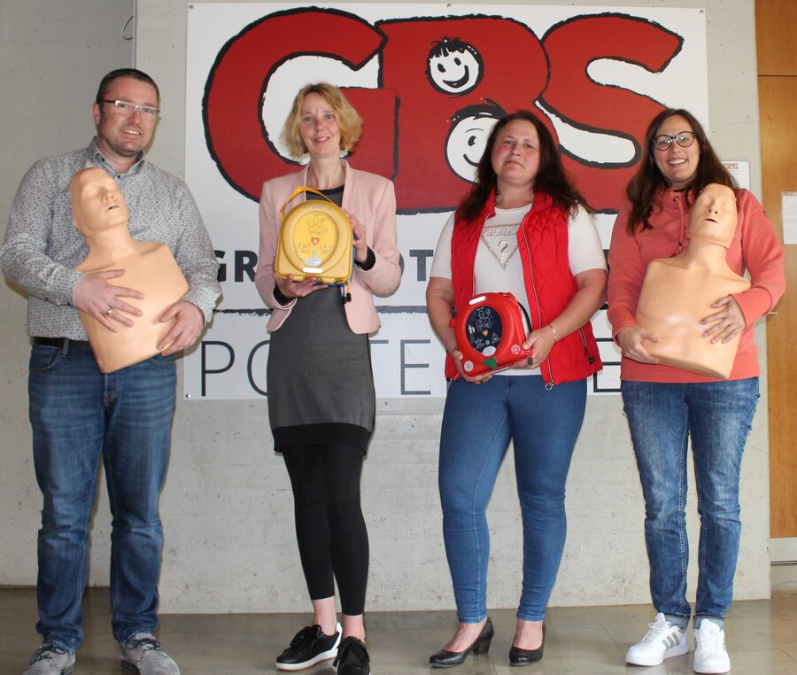 „Es ist schon beeindruckend, was die Schule in diesem Bereich so alles bietet“, meint Daniela Adler, Regionalleiterin der VR Bank Bayreuth-Hof eG im Rahmen der Übergabe des „Retten macht Schule“-Pakets an die GBS. In Zusammenarbeit mit dem Förderverein der Schule finanziert die Bank ein umfangreiches Paket aus 15 Übungspuppen, einem Übungs-Defibrillator und einem voll funktionsfähigen Defibrillator im Gesamtwert von 3850 €. „Das eröffnet uns nun ganz neue Möglichkeiten in der Ausbildung“, sagt die Erste-Hilfe-Beauftrage Corinna Bruckmayer. „In Zukunft können nun 15 Schüler gleichzeitig üben, wie man im Ernstfall eine Wiederbelebung durchführt.“ Und auch Schulleiter Marco Speckner zeigt sich erfreut: „Eine derartige Zuwendung ist immer auch Wertschätzung für die geleistete Arbeit.“