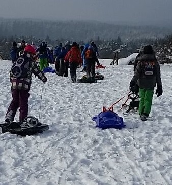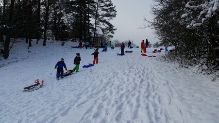 Die Schülerinnnen und Schüler aus der 6. und 7. Jahrgangsstufe, die sich zum Schlittenfahren gemeldet hatten, begleiteten unsere beiden 1. Klassen.
